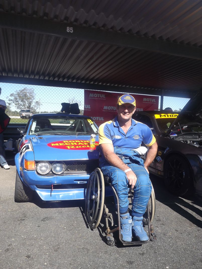 Stopping along the way to admire/drool over various other race cars, I then looked over, and what do I see, but a little blue and yellow beast (Toyota Celica), with a guy in a wheelchair sitting in front of it. Wow…this was the moment I had been wanting for literally years…I still could not believe it. I strolled up to him, introduced myself and told him that Id been wanting to meet a disabled racer for…well..forever. We sat and had a great chat about his racing, his car, the handcontrols (of which I got to have a closeup look at…and to touch…wow!), and chatting about other things as well. It was awesome. This man (Matt Speakman), was living THE dream…getting out there on that track, in his racecar with the handcontrols, in amongst it all. Just….awesome! Sitting there, I was actually in awe…(and just quietly, knowing that I could actually drive that racecar, as it had handcontrols….I had to fight back the urge to want to jump in it and take it for a spin…haha… For one, I dont have a (racing) licence…and for two, that would be just wrong of me! haha)