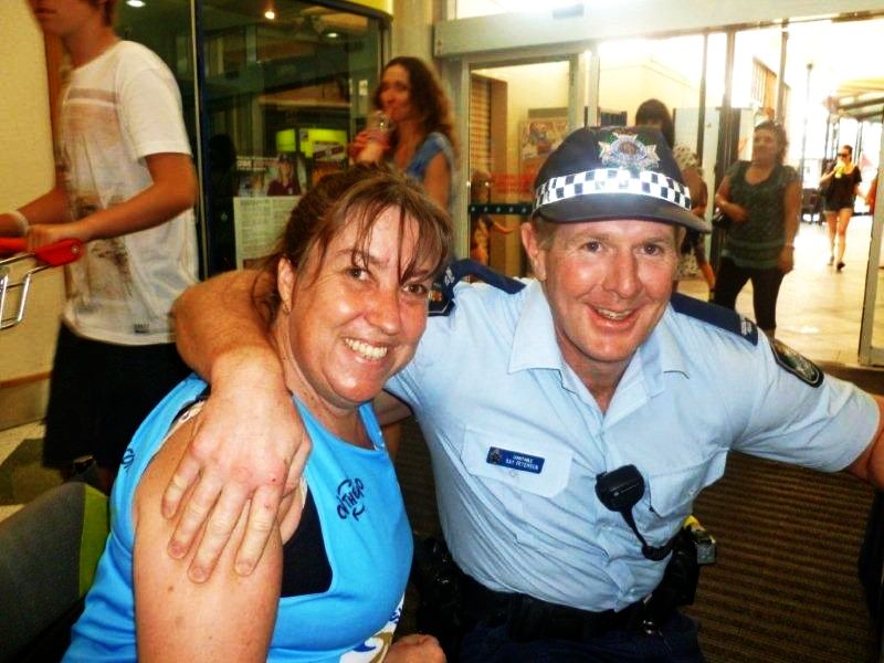 Opportunities seem to come out of absolutely nowhere at times..and this certainly was no different – it was awesome how this came about, so easily! 🙂 On Saturday 22nd September, 2012, I headed to Sunshine Plaza Maroochydore, based at the Community Table down there, to raise funds for my chosen charity for my Fundraiser Event on November 2, 2012. When I was settled in and set up for the mornings adventures, I noticed the Police Beat opposite me. I didnt think a lot more of it…except for hoping to catch the eye of the ‘boy in blue’ who was based there, when he walked out of the office, to see if he would be kind enough to support the charity 😉 But…he was just too busy to come over…dammit 😦 haha… Sunday 23rd September – I headed back to Sunshine Plaza, to raise further funds for the charity. As I was setting up, the policeman who I had tried to catch his eye the day before came over for a chat, it was awesome to talk to him about what I am achieving, with my bucket list, my Fitness Goals, and my Fundraiser Event. He seemed genuinely curious and interested in what I was doing, which was great. Oh, and he (‘Policeman Ray’) supported the charity – awesome! 😀 When he went back inside the Police Beat office, it struck me – No. #125 on my bucket list – ‘Hug a Policeman’!! Opportunity – it was LITERALLY right in front of me..haha. So, a while later, when my Mum was there with her camera, I rocked into the Police Beat and cheekily asked ‘Policeman Ray’, “I have a favour to ask…you know my bucket list I talked to you about…one of the things on it is to Hug a Policeman – would you help me tick this off, can I please have a hug, Ray?”, I smiled sweetly 🙂 …Ray was very cool about it, a big smile appeared on his face, and he immediately came out and gave me a hug and posed for a photo..