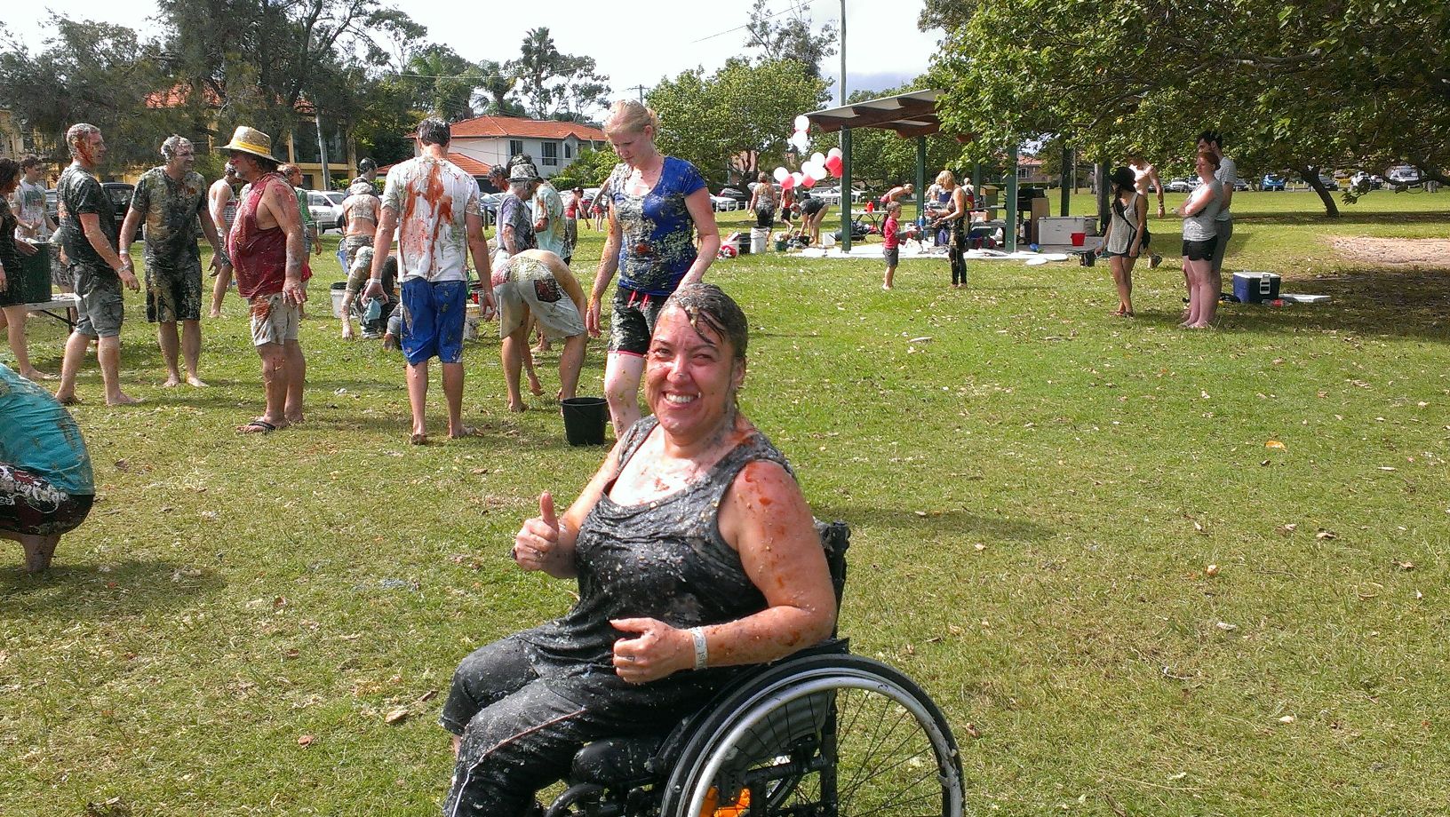 As it happened, I turned out to be a ‘sitting duck’ – a table was placed next to me, with my ‘ammo’, so I didnt have to leave where I was, in amongst the madness….but that just made me a target for everyone to come over and attack me, with me not being able to move away from them (I was so slippery that my wheels/rims on my chair just didnt have any grip at all!). The group didnt ‘go gentle on the chick in the wheelchair’ at all, and thats what made it more awesome…I was ‘fair game’ just like everyone else..haha…loved it! 😀